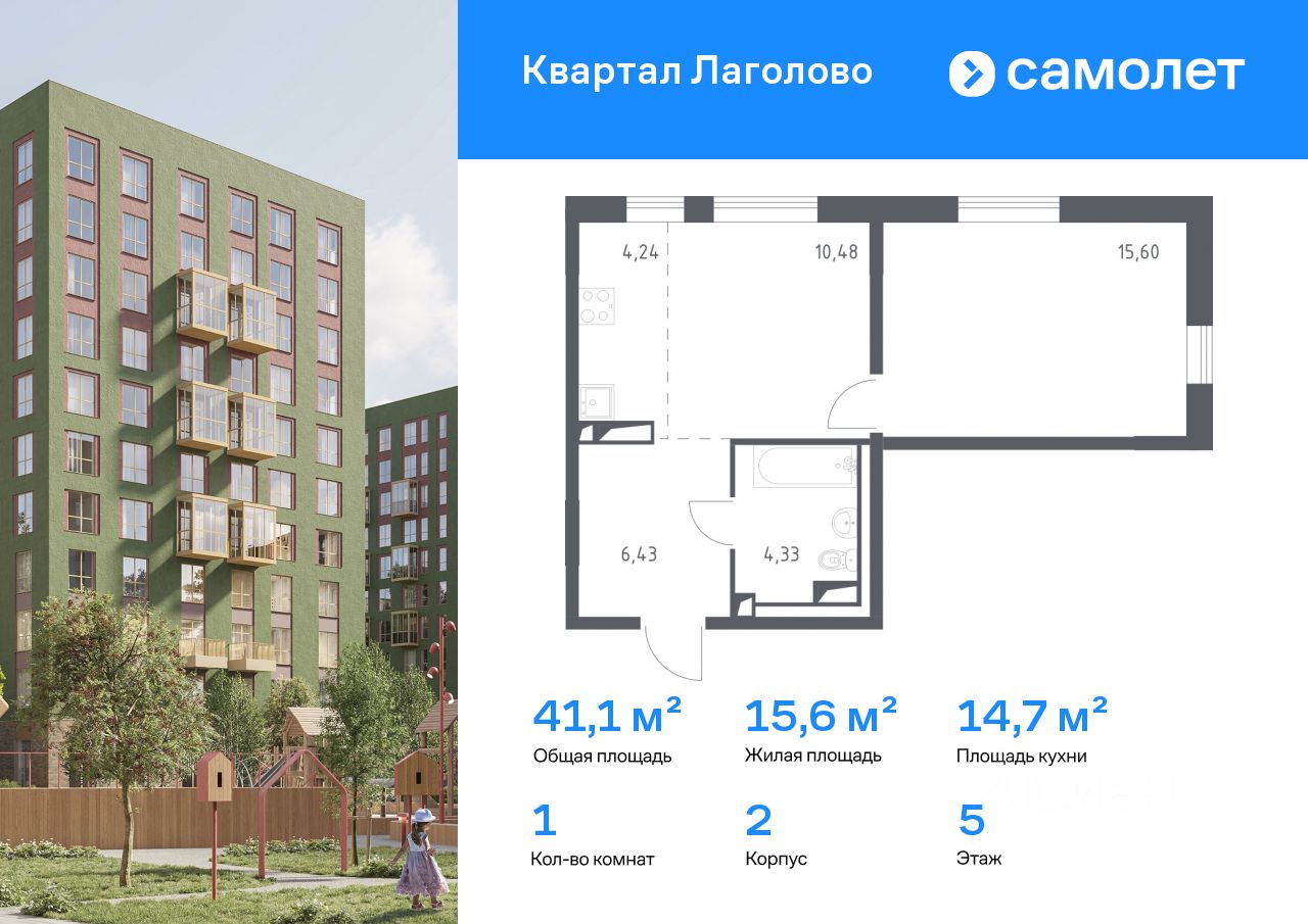 Строим кварталы для жизни с заботой о будущем. Предлагается 1-комнатная квартира комфорт-класса 41,08 кв.м в корпусе 2 на 5 этаже, в ЖК "Квартал Лаголово"