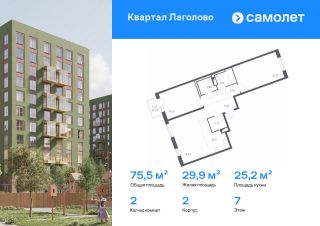 Строим кварталы для жизни с заботой о будущем. Предлагается 2-комнатная квартира комфорт-класса 75,46 кв.м в корпусе 2 на 7 этаже, в ЖК "Квартал Лаголово"