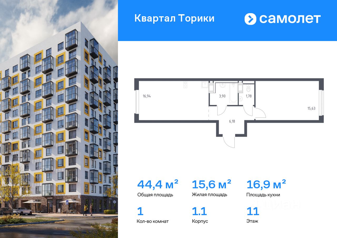 Строим кварталы для жизни с заботой о будущем. Предлагается 1-комнатная квартира комфорт-класса 44,43 кв.м в корпусе 1.1 на 11 этаже, в ЖК "Квартал Торики"