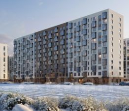 Современные монолитные дома высотой 12 этажей выполнены в нейтральной цветовой гамме с яркими акцентами.
