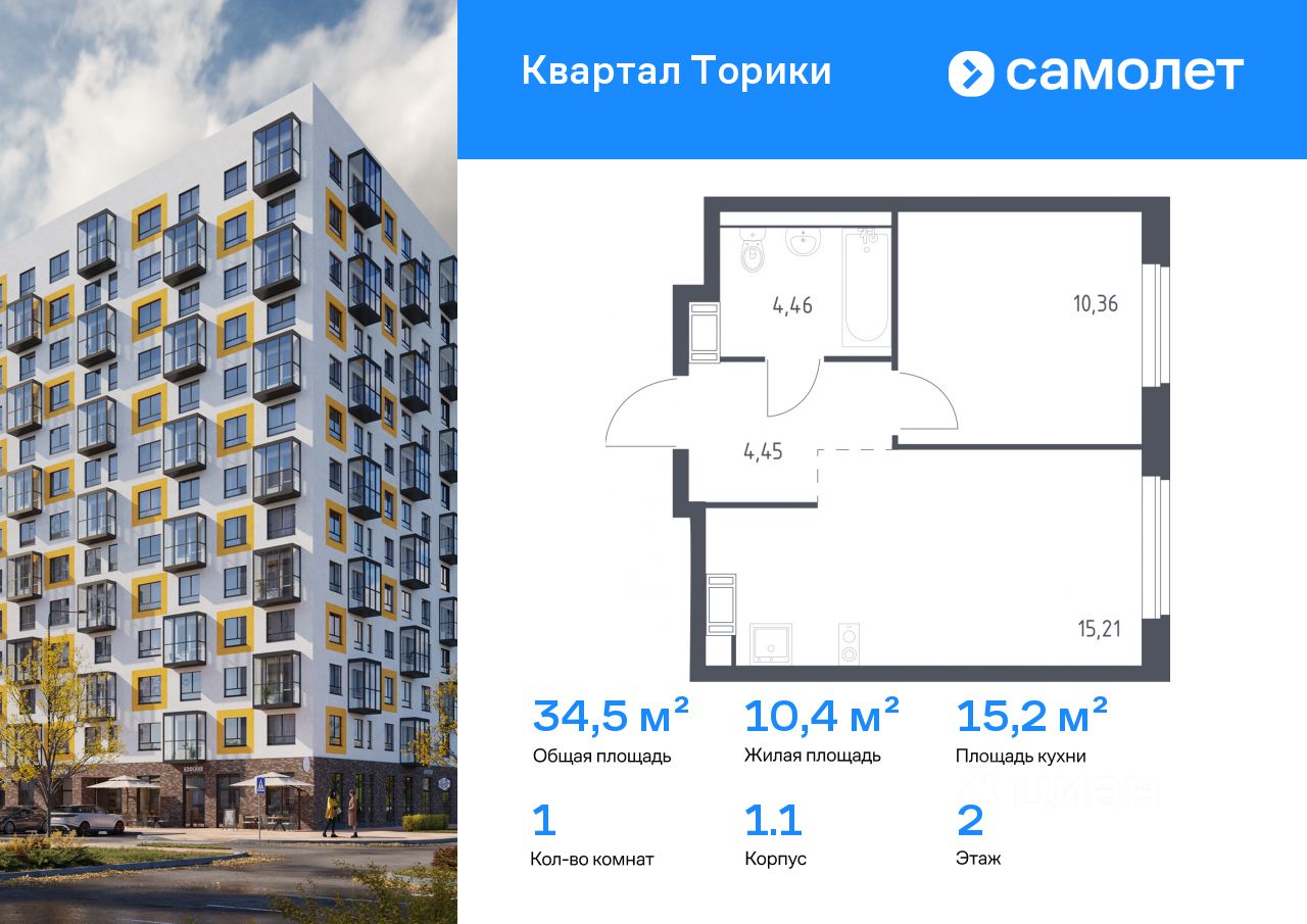 Строим кварталы для жизни с заботой о будущем. Предлагается 1-комнатная квартира комфорт-класса 34,48 кв.м в корпусе 1.1 на 2 этаже, в ЖК "Квартал Торики"