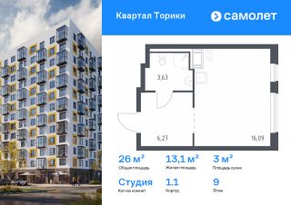 Строим кварталы для жизни с заботой о будущем. Предлагается квартира студия комфорт-класса 25,99 кв.м в корпусе 1.1 на 9 этаже, в ЖК "Квартал Торики"