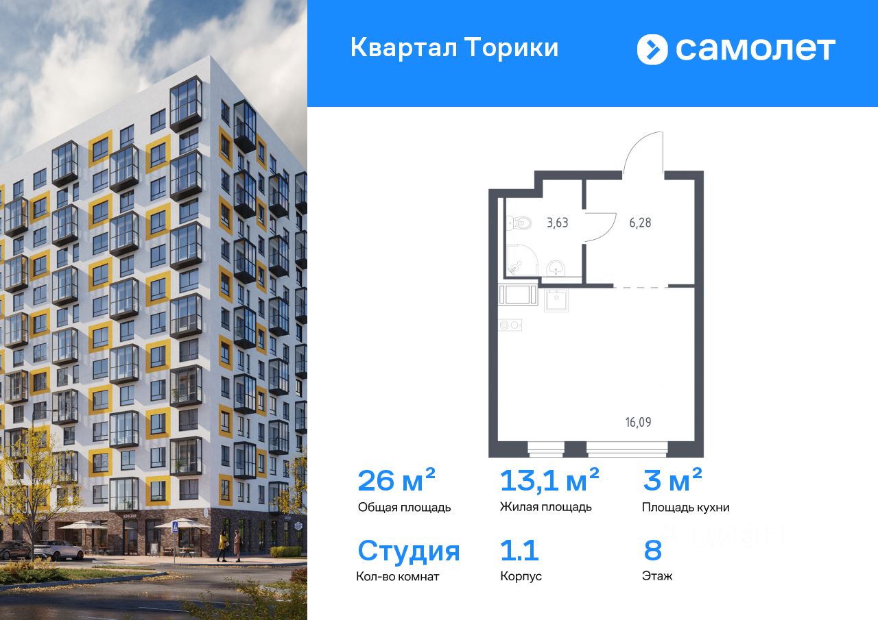 Строим кварталы для жизни с заботой о будущем. Предлагается квартира студия комфорт-класса 26 кв.м в корпусе 1.1 на 8 этаже, в ЖК "Квартал Торики"