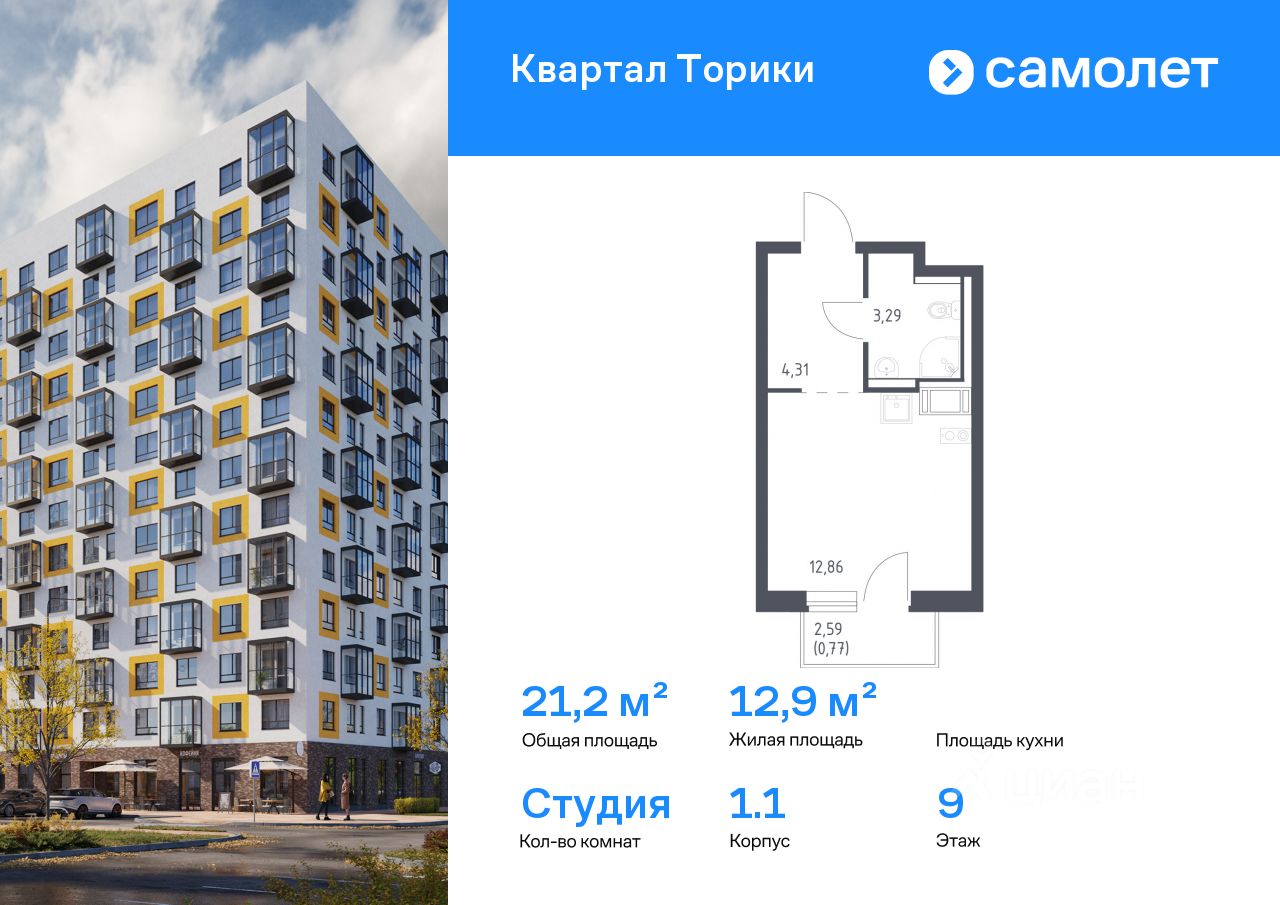 Строим кварталы для жизни с заботой о будущем. Предлагается квартира студия комфорт-класса 21,23 кв.м в корпусе 1.1 на 9 этаже, в ЖК "Квартал Торики"