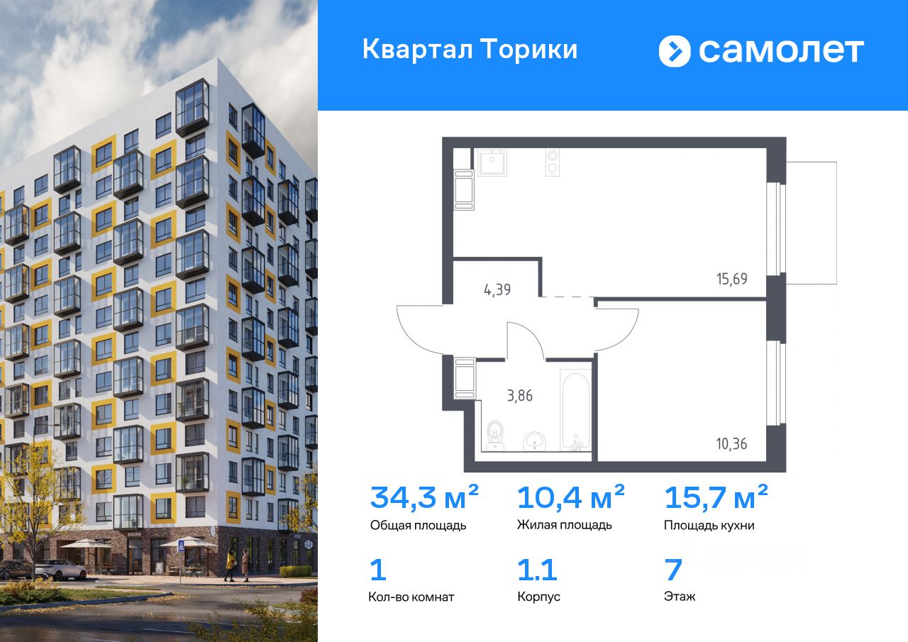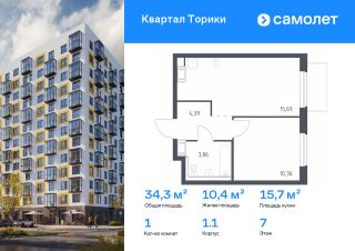 Строим кварталы для жизни с заботой о будущем. Предлагается 1-комнатная квартира комфорт-класса 34,3 кв.м в корпусе 1.1 на 7 этаже, в ЖК "Квартал Торики"