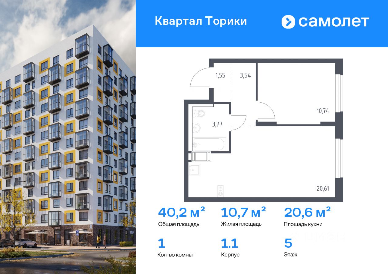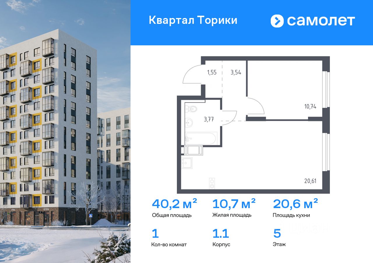 Строим кварталы для жизни с заботой о будущем. Предлагается 1-комнатная квартира комфорт-класса 40,21 кв.м в корпусе 1.1 на 5 этаже, в ЖК "Квартал Торики"