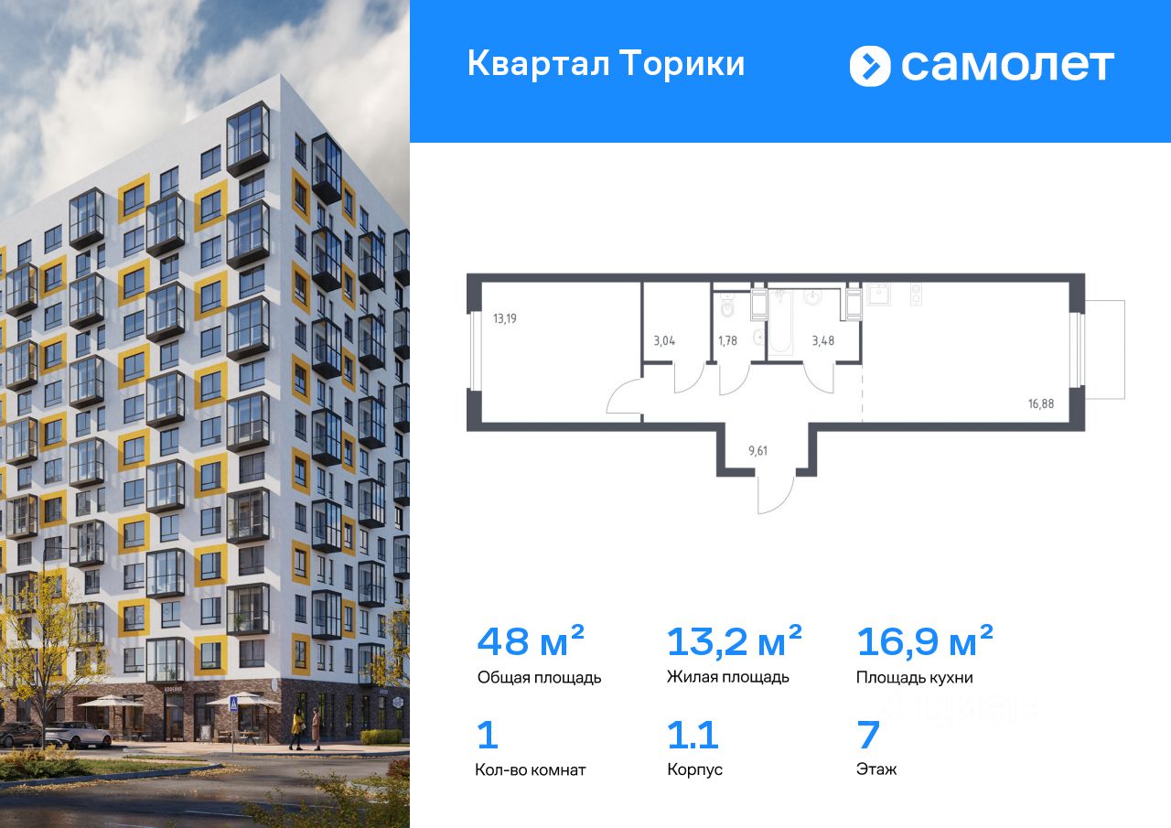 Строим кварталы для жизни с заботой о будущем. Предлагается 1-комнатная квартира комфорт-класса 47,98 кв.м в корпусе 1.1 на 7 этаже, в ЖК "Квартал Торики"