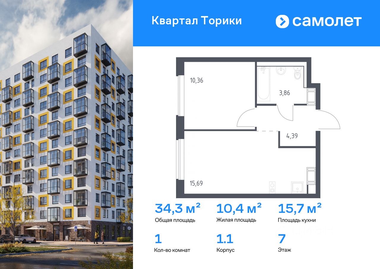 Строим кварталы для жизни с заботой о будущем. Предлагается 1-комнатная квартира комфорт-класса 34,3 кв.м в корпусе 1.1 на 7 этаже, в ЖК "Квартал Торики"
