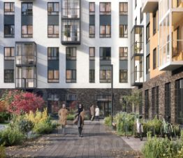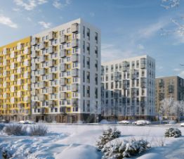 Современные монолитные дома высотой 12 этажей выполнены в нейтральной цветовой гамме с яркими акцентами.