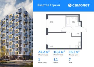 Строим кварталы для жизни с заботой о будущем. Предлагается 1-комнатная квартира комфорт-класса 34,31 кв.м в корпусе 1.1 на 7 этаже, в ЖК "Квартал Торики"