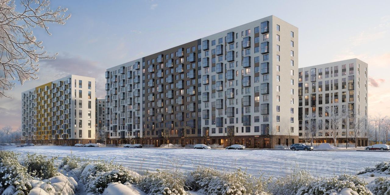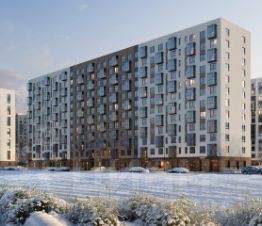Современные монолитные дома высотой 12 этажей выполнены в нейтральной цветовой гамме с яркими акцентами.