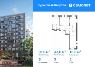 Строим кварталы для жизни с заботой о будущем. Предлагается 3-комнатная квартира комфорт-класса 91,9 кв.м в корпусе 3 на 2 этаже, в ЖК "Курортный Квартал"