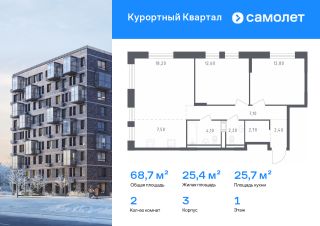 Строим кварталы для жизни с заботой о будущем. Предлагается 2-комнатная квартира комфорт-класса 68,7 кв.м в корпусе 3 на 1 этаже, в ЖК "Курортный Квартал"
