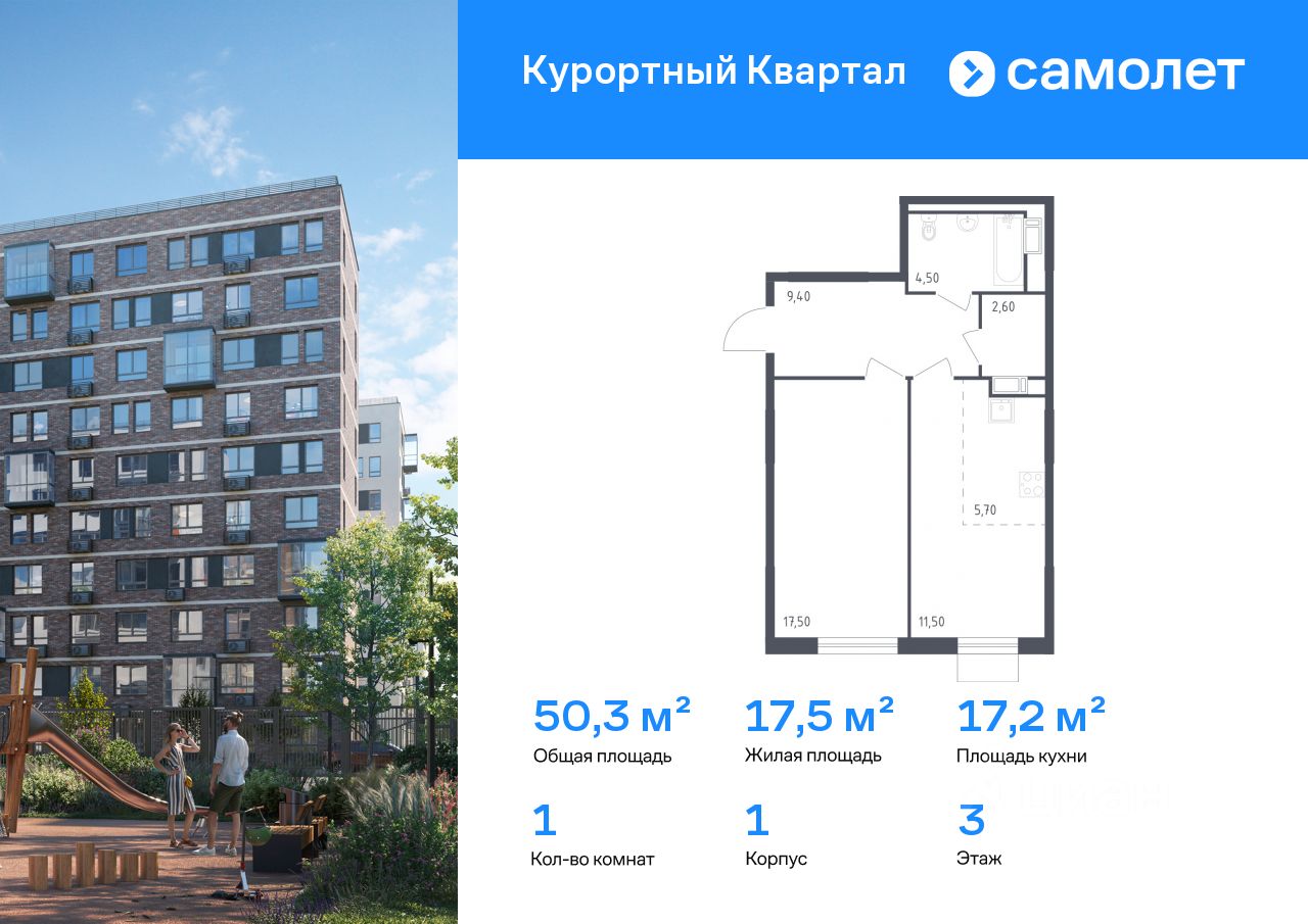 Строим кварталы для жизни с заботой о будущем. Предлагается 1-комнатная квартира комфорт-класса 50,3 кв.м в корпусе 1 на 3 этаже, в ЖК "Курортный Квартал"