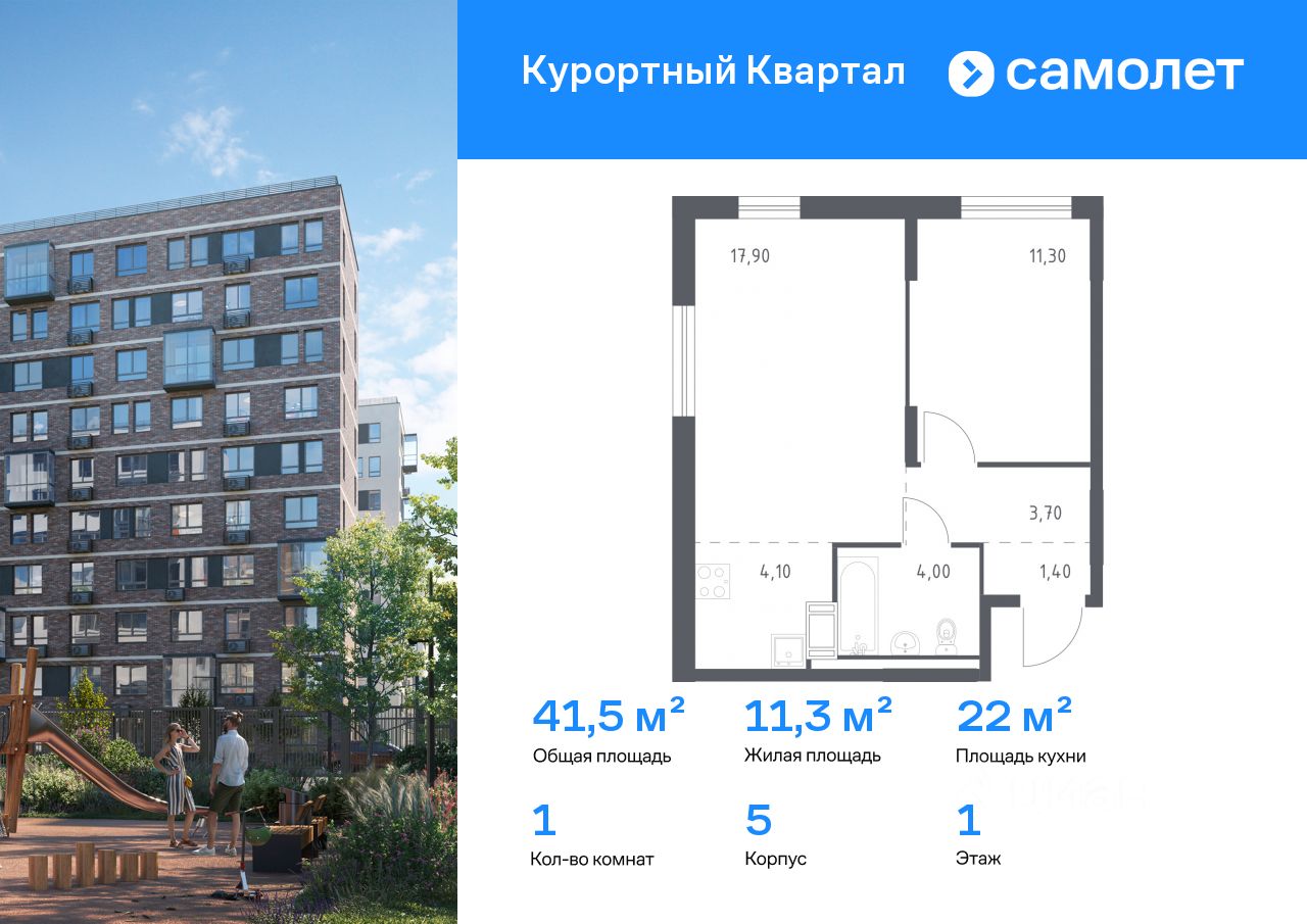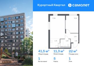 Строим кварталы для жизни с заботой о будущем. Предлагается 1-комнатная квартира комфорт-класса 41,5 кв.м в корпусе 5 на 1 этаже, в ЖК "Курортный Квартал"