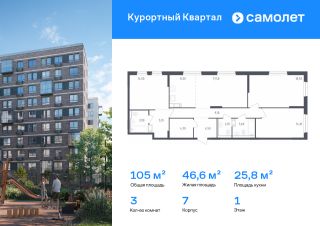 Строим кварталы для жизни с заботой о будущем. Предлагается 3-комнатная квартира комфорт-класса 105 кв.м в корпусе 7 на 1 этаже, в ЖК "Курортный Квартал"