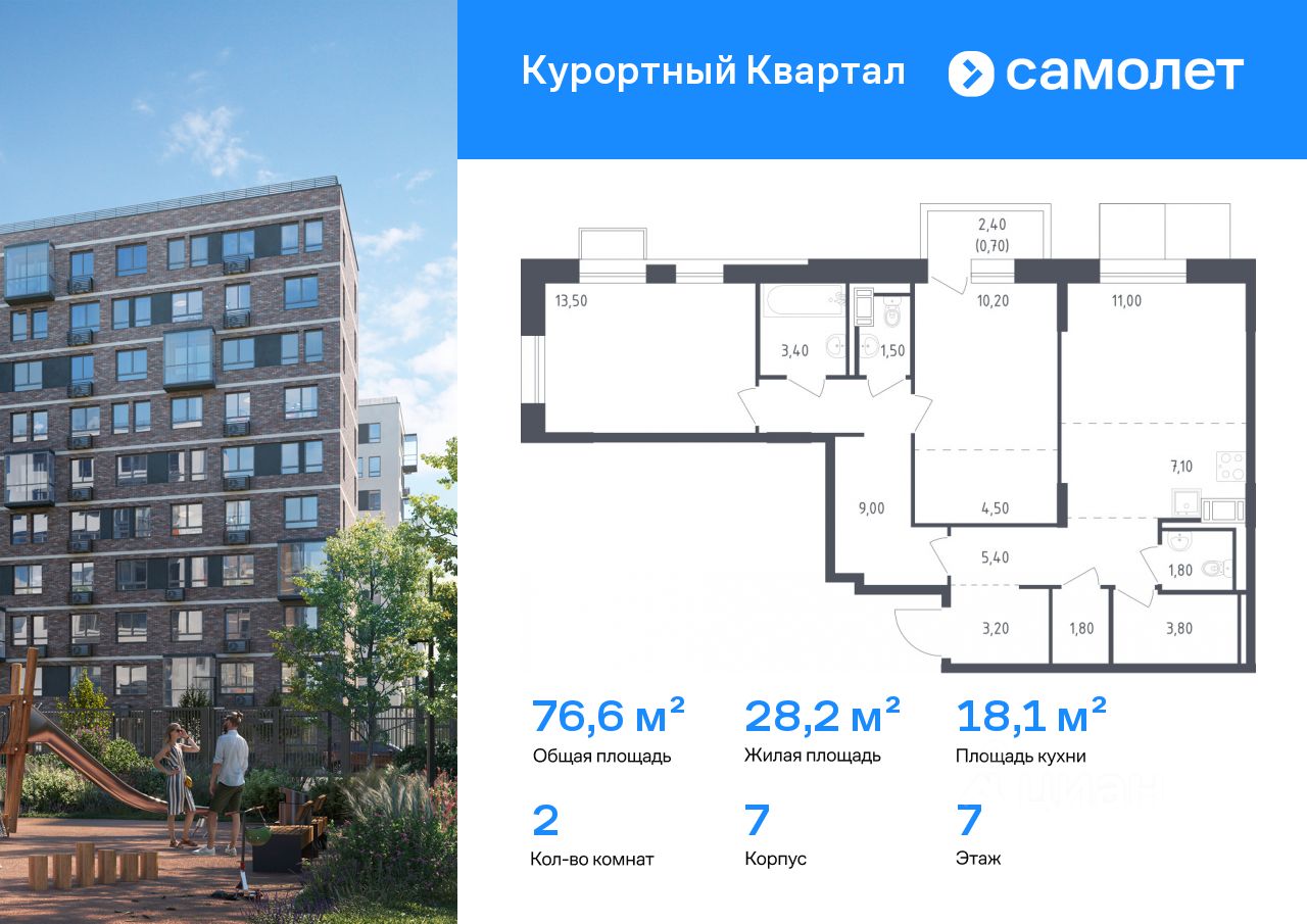 Строим кварталы для жизни с заботой о будущем. Предлагается 2-комнатная квартира комфорт-класса 76,6 кв.м в корпусе 7 на 7 этаже, в ЖК "Курортный Квартал"