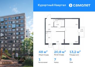 Строим кварталы для жизни с заботой о будущем. Предлагается 1-комнатная квартира комфорт-класса 48 кв.м в корпусе 7 на 5 этаже, в ЖК "Курортный Квартал"