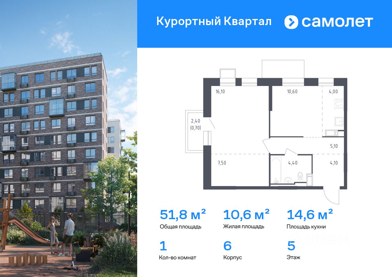 Строим кварталы для жизни с заботой о будущем. Предлагается 1-комнатная квартира комфорт-класса 51,8 кв.м в корпусе 6 на 5 этаже, в ЖК "Курортный Квартал"
