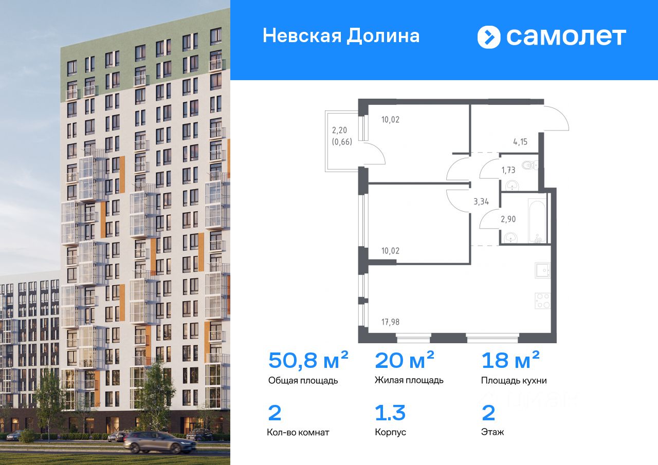 Строим кварталы для жизни с заботой о будущем. Предлагается 2-комнатная квартира комфорт-класса 50,8 кв.м в корпусе 1.3 на 2 этаже, в ЖК "Невская Долина"