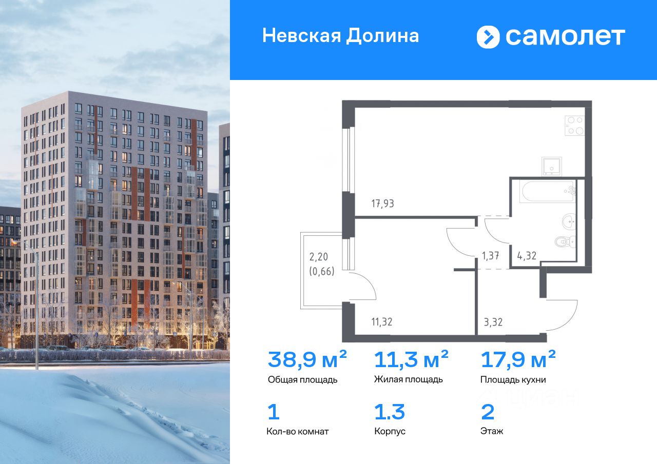 Строим кварталы для жизни с заботой о будущем. Предлагается 1-комнатная квартира комфорт-класса 38,92 кв.м в корпусе 1.3 на 2 этаже, в ЖК "Невская Долина"