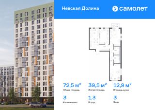 Строим кварталы для жизни с заботой о будущем. Предлагается 3-комнатная квартира комфорт-класса 72,46 кв.м в корпусе 1.3 на 3 этаже, в ЖК "Невская Долина"