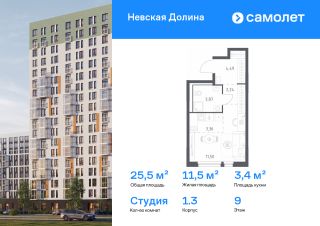 Строим кварталы для жизни с заботой о будущем. Предлагается квартира студия комфорт-класса 25,46 кв.м в корпусе 1.3 на 9 этаже, в ЖК "Невская Долина"