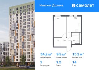 Строим кварталы для жизни с заботой о будущем. Предлагается 1-комнатная квартира комфорт-класса 34,22 кв.м в корпусе 1.2 на 14 этаже, в ЖК "Невская Долина"
