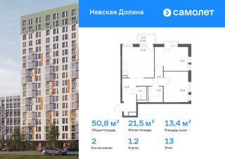 Строим кварталы для жизни с заботой о будущем. Предлагается 2-комнатная квартира комфорт-класса 50,77 кв.м в корпусе 1.2 на 13 этаже, в ЖК "Невская Долина"