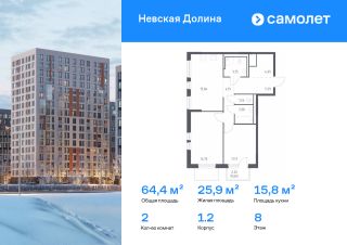 Строим кварталы для жизни с заботой о будущем. Предлагается 2-комнатная квартира комфорт-класса 64,43 кв.м в корпусе 1.2 на 8 этаже, в ЖК "Невская Долина"