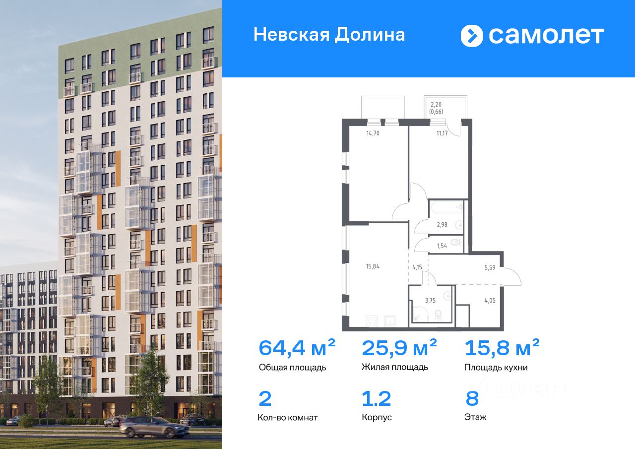 Строим кварталы для жизни с заботой о будущем. Предлагается 2-комнатная квартира комфорт-класса 64,43 кв.м в корпусе 1.2 на 8 этаже, в ЖК "Невская Долина"