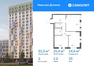 Строим кварталы для жизни с заботой о будущем. Предлагается 2-комнатная квартира комфорт-класса 51,25 кв.м в корпусе 1.2 на 15 этаже, в ЖК "Невская Долина"