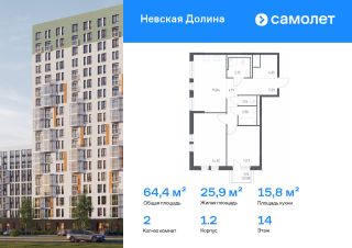 Строим кварталы для жизни с заботой о будущем. Предлагается 2-комнатная квартира комфорт-класса 64,35 кв.м в корпусе 1.2 на 14 этаже, в ЖК "Невская Долина"