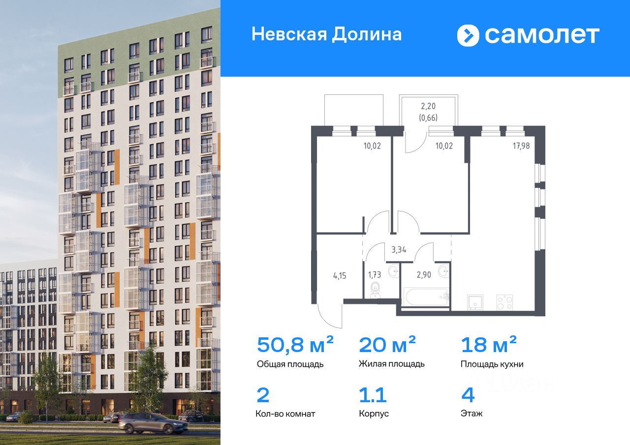 Строим кварталы для жизни с заботой о будущем. Предлагается 2-комнатная квартира комфорт-класса 50,8 кв.м в корпусе 1.1 на 4 этаже, в ЖК "Невская Долина"