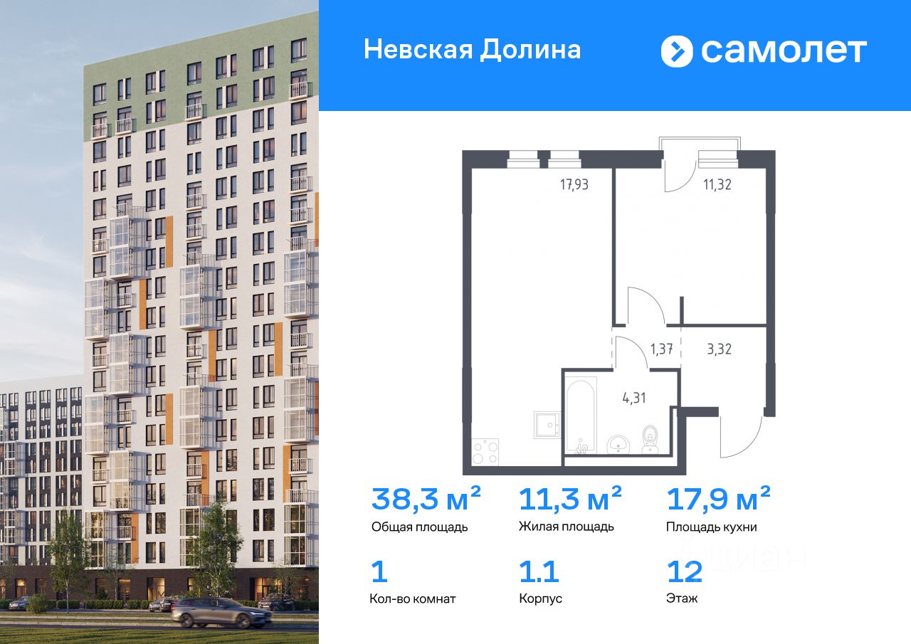 Строим кварталы для жизни с заботой о будущем. Предлагается 1-комнатная квартира комфорт-класса 38,25 кв.м в корпусе 1.1 на 12 этаже, в ЖК "Невская Долина"
