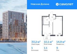 Строим кварталы для жизни с заботой о будущем. Предлагается 1-комнатная квартира комфорт-класса 33,23 кв.м в корпусе 1.1 на 5 этаже, в ЖК "Невская Долина"