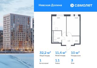 Строим кварталы для жизни с заботой о будущем. Предлагается 1-комнатная квартира комфорт-класса 32,15 кв.м в корпусе 1.1 на 3 этаже, в ЖК "Невская Долина"