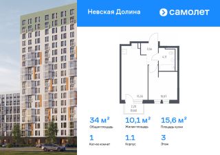 Строим кварталы для жизни с заботой о будущем. Предлагается 1-комнатная квартира комфорт-класса 33,95 кв.м в корпусе 1.1 на 3 этаже, в ЖК "Невская Долина"