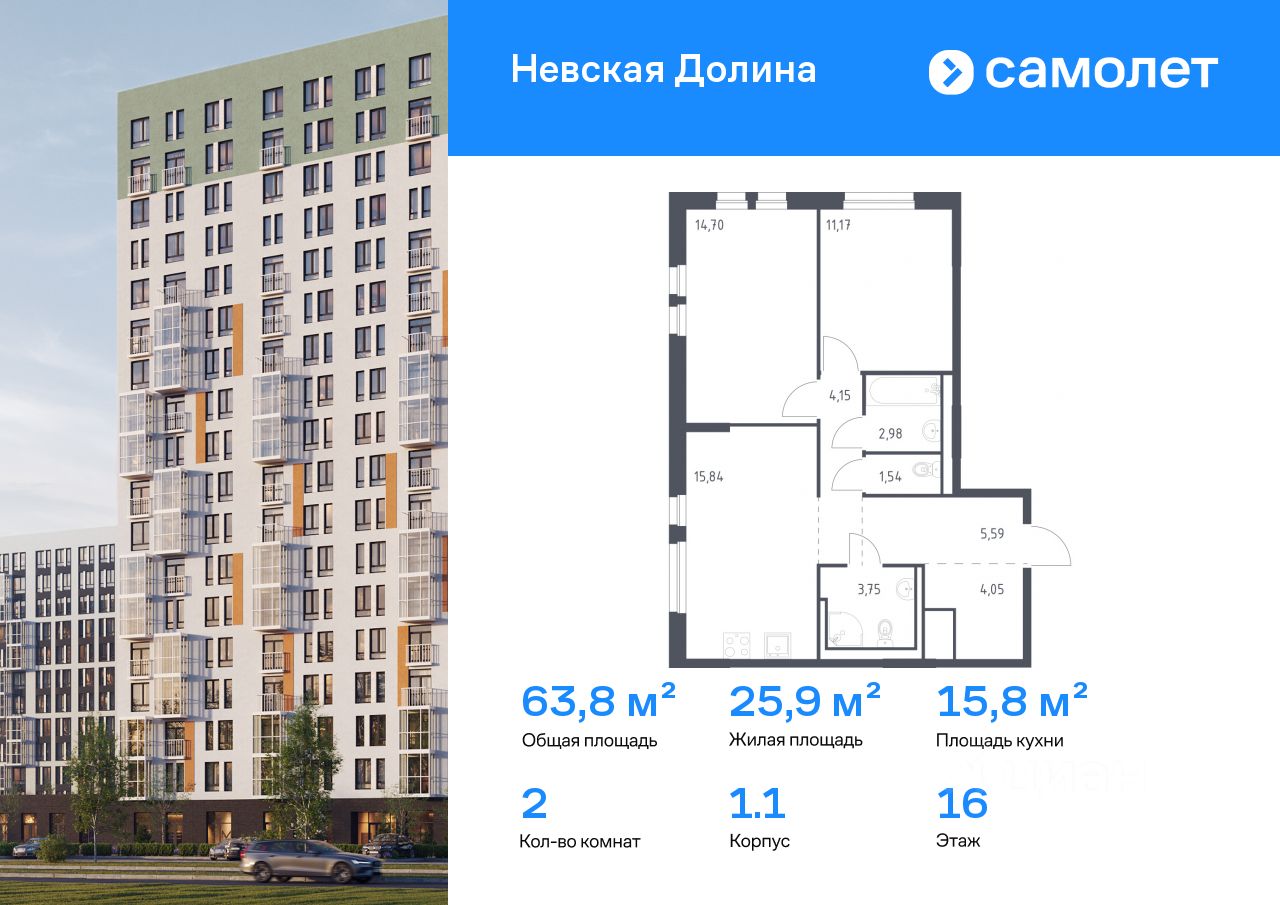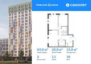 Строим кварталы для жизни с заботой о будущем. Предлагается 2-комнатная квартира комфорт-класса 63,77 кв.м в корпусе 1.1 на 16 этаже, в ЖК "Невская Долина"