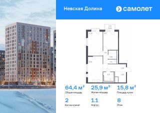 Строим кварталы для жизни с заботой о будущем. Предлагается 2-комнатная квартира комфорт-класса 64,43 кв.м в корпусе 1.1 на 8 этаже, в ЖК "Невская Долина"