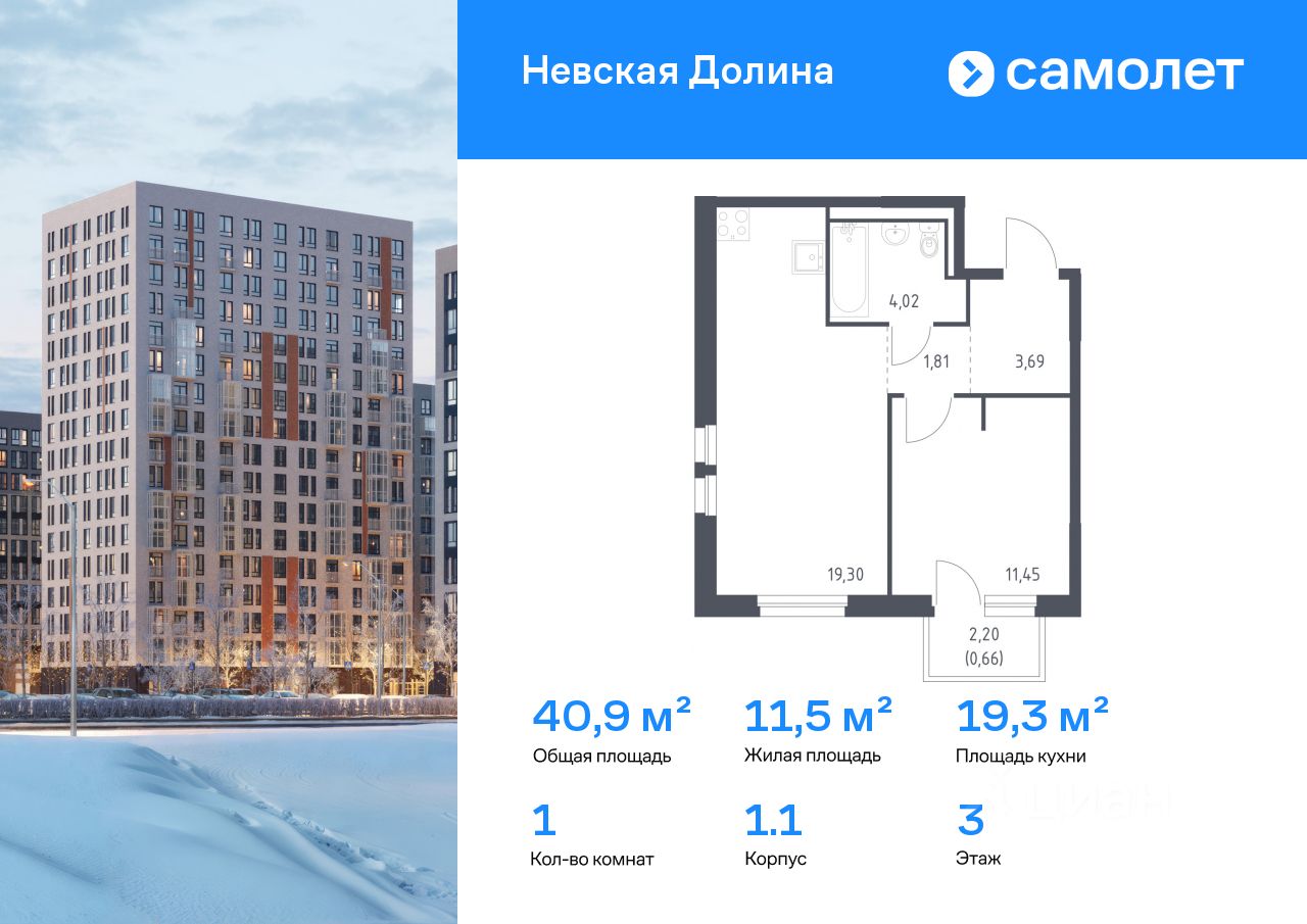 Строим кварталы для жизни с заботой о будущем. Предлагается 1-комнатная квартира комфорт-класса 40,93 кв.м в корпусе 1.1 на 3 этаже, в ЖК "Невская Долина"