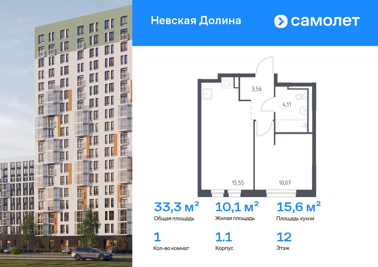 Строим кварталы для жизни с заботой о будущем. Предлагается 1-комнатная квартира комфорт-класса 33,29 кв.м в корпусе 1.1 на 12 этаже, в ЖК "Невская Долина"