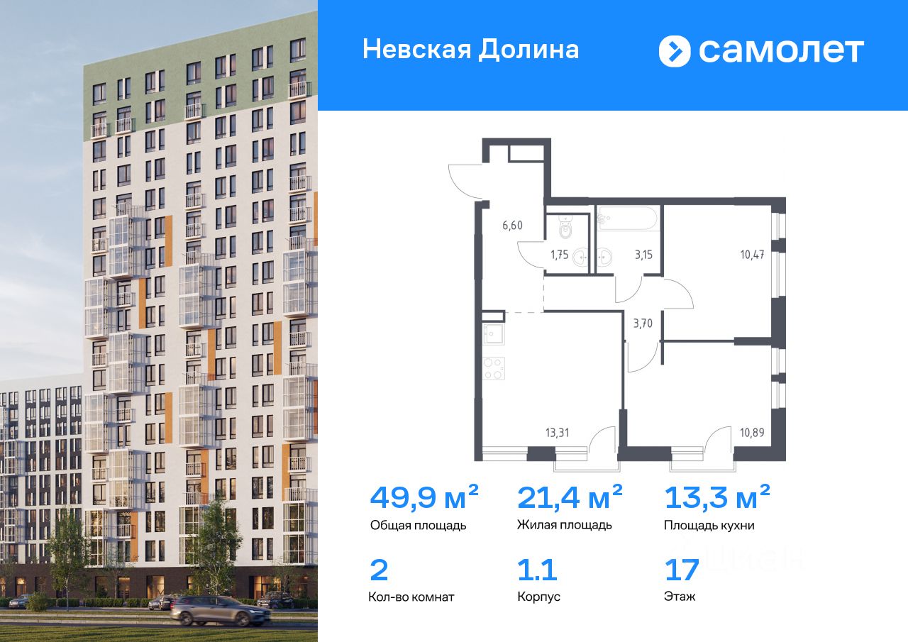 Строим кварталы для жизни с заботой о будущем. Предлагается 2-комнатная квартира комфорт-класса 49,87 кв.м в корпусе 1.1 на 17 этаже, в ЖК "Невская Долина"