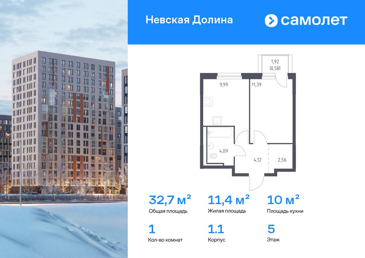 Строим кварталы для жизни с заботой о будущем. Предлагается 1-комнатная квартира комфорт-класса 32,73 кв.м в корпусе 1.1 на 5 этаже, в ЖК "Невская Долина"