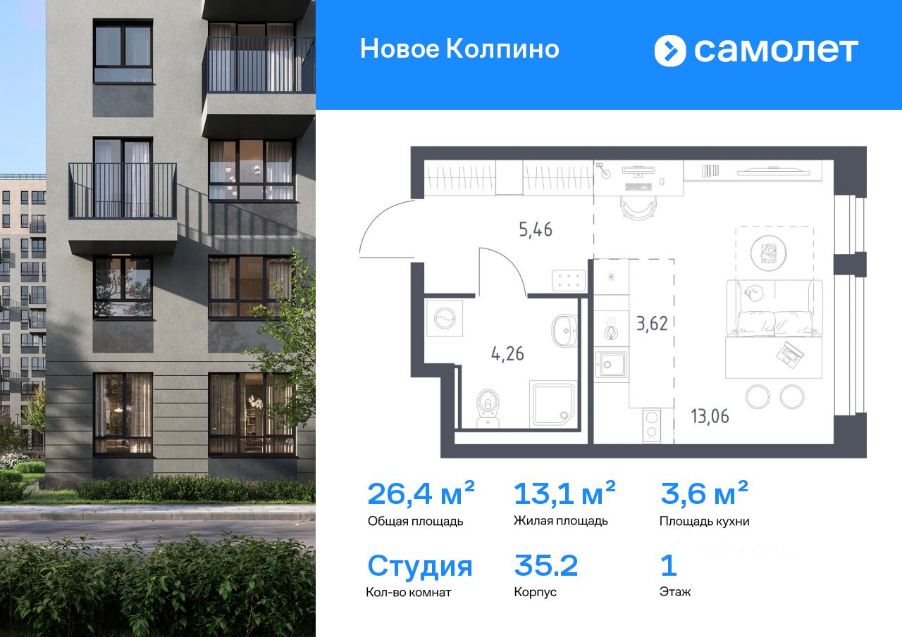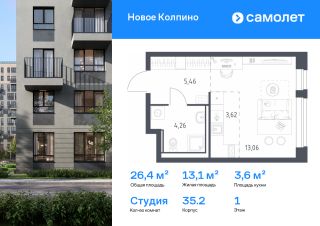 Строим кварталы для жизни с заботой о будущем. Предлагается квартира студия комфорт-класса 26,4 кв.м в корпусе 35.2 на 1 этаже, в ЖК "Новое Колпино"