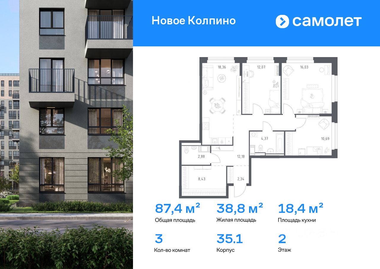 Строим кварталы для жизни с заботой о будущем. Предлагается 3-комнатная квартира комфорт-класса 87,35 кв.м в корпусе 35.1 на 2 этаже, в ЖК "Новое Колпино"