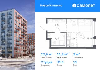 Строим кварталы для жизни с заботой о будущем. Предлагается квартира студия комфорт-класса 22,86 кв.м в корпусе 35.1 на 11 этаже, в ЖК "Новое Колпино"