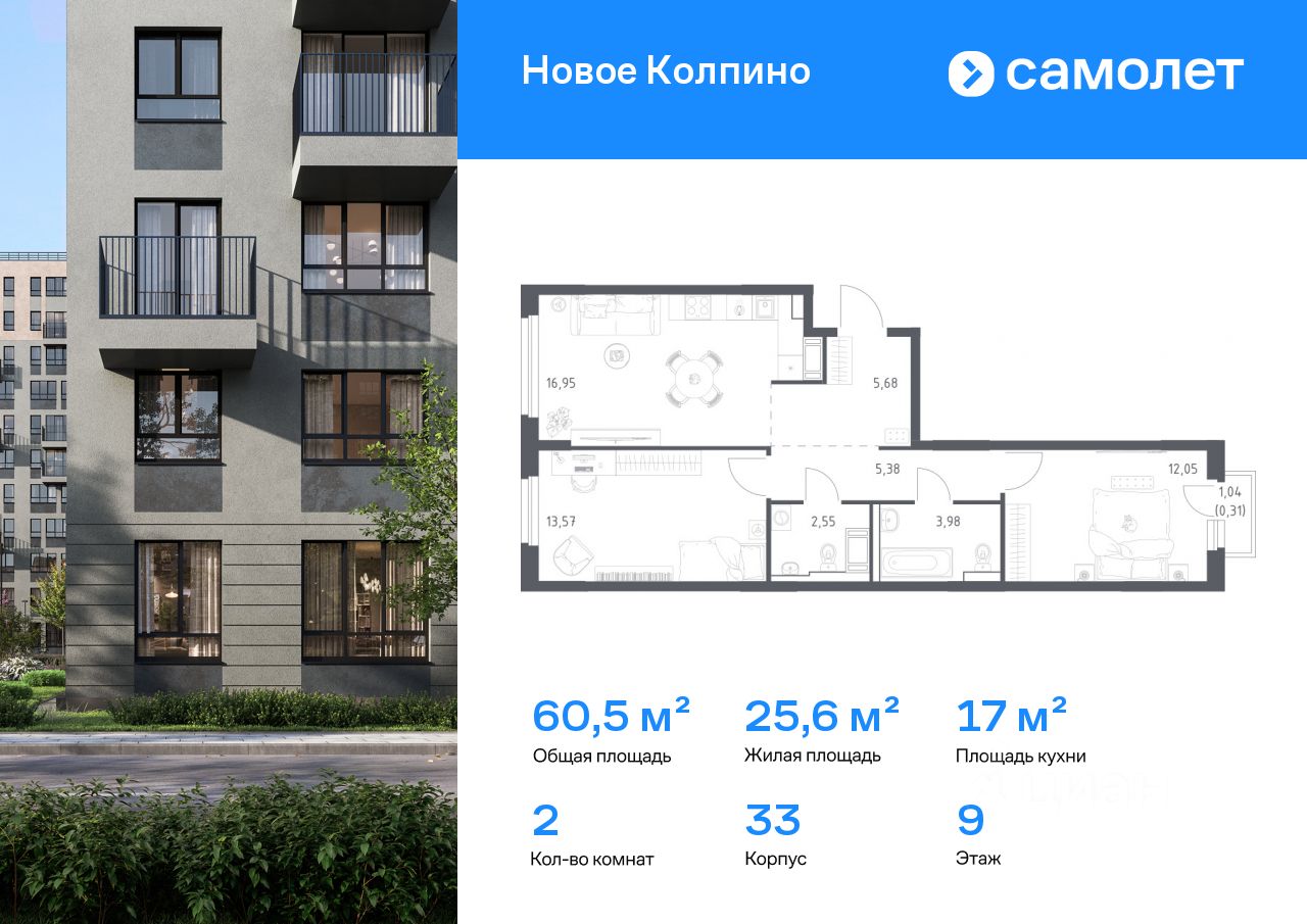 Строим кварталы для жизни с заботой о будущем. Предлагается 2-комнатная квартира комфорт-класса 60,47 кв.м в корпусе 33 на 9 этаже, в ЖК "Новое Колпино"