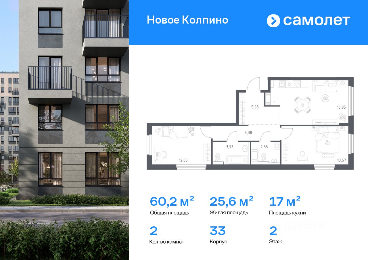 Строим кварталы для жизни с заботой о будущем. Предлагается 2-комнатная квартира комфорт-класса 60,16 кв.м в корпусе 33 на 2 этаже, в ЖК "Новое Колпино"