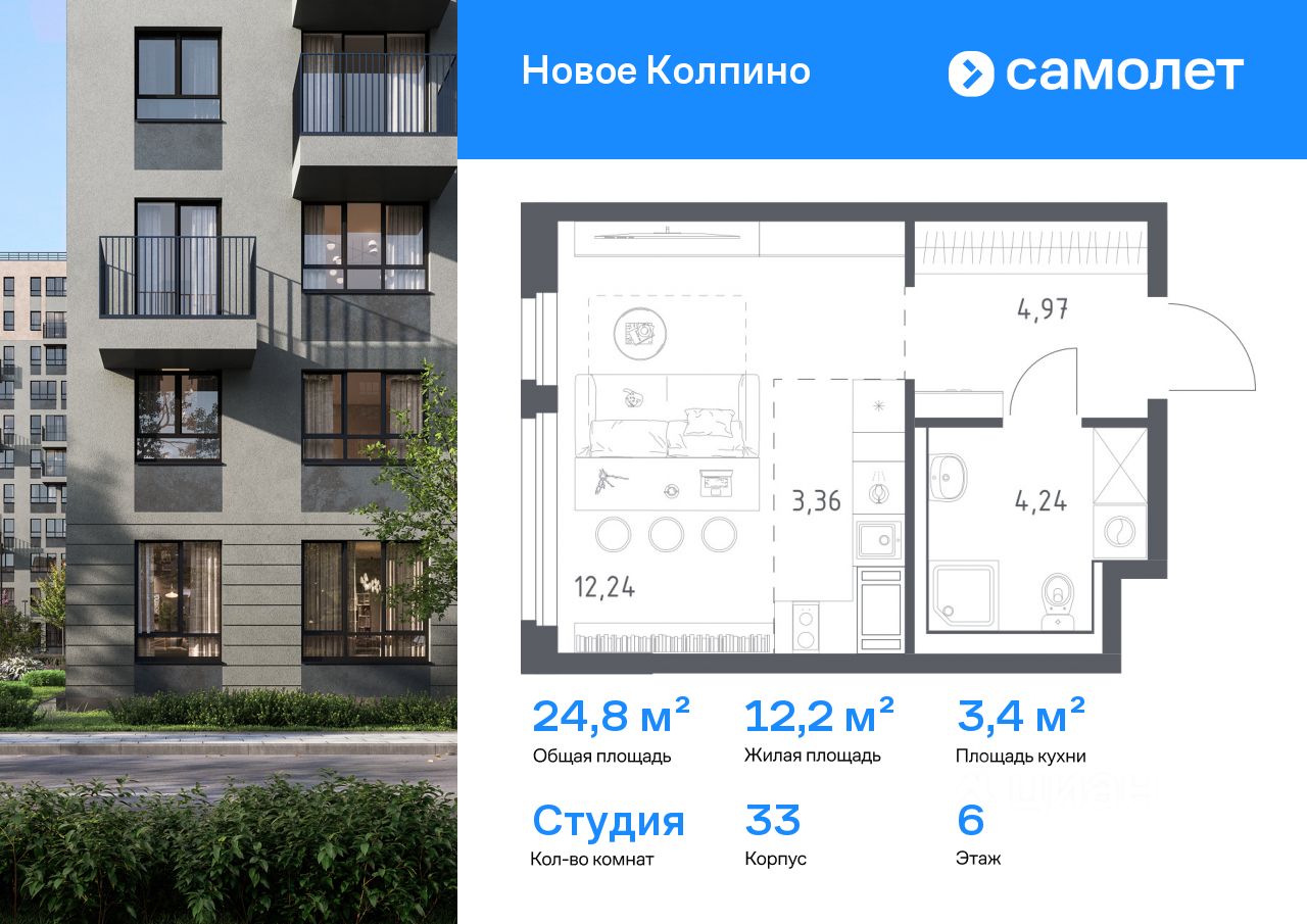 Строим кварталы для жизни с заботой о будущем. Предлагается квартира студия комфорт-класса 24,81 кв.м в корпусе 33 на 6 этаже, в ЖК "Новое Колпино"